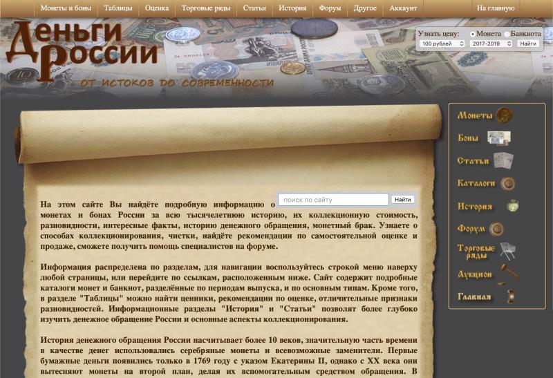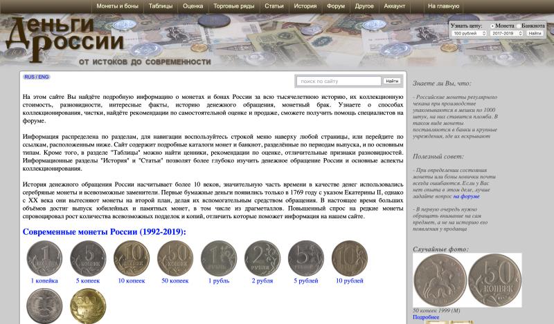 Создание сайта растянулось на 4 месяца, он состоял из 63 страниц, которые имели очень простой дизайн. На главной странице размещались ссылки на 3 раздела: «Монеты», «Банкноты», «История», каждый из них делился ещё на несколько частей, а они включали в себя ссылки уже на конечные страницы. С каждой страницы можно было перейти на главную. Над названием сайта долго думать не пришлось, оно появилось само собой, простое и понятное: «Деньги России». Сайт содержал информацию о двух тысячах монет и 270 банкнотах (разновидности не учитывались). По сути он представлял из себя каталог, реализованный в электронном виде. Все рыночные цены были взяты из каталогов крупных интернет-аукционов, остальное – из различных источников с тщательной переработкой и дополнением. Вначале была написана история денежного обращения, разделённая на историю монет, банкнот и краткая история всех денег. Потом добавлялись другие статьи и таблицы.