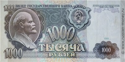 Лицевая сторона банкноты имеет белое поле справа, на котором внизу находится гильоширная розетка с числом "1000", над ней дата "1991". Наверху белого поля поверх узора надпись мелким шрифтом в три строки - "БАНКОВСКИЕ БИЛЕТЫ ОБЕСПЕЧИВАЮТСЯ ЗОЛОТОМ, ДРАГОЦЕННЫМИ МЕТАЛЛАМИ И ПРОЧИМИ АКТИВАМИ ГОСУДАРСТВЕННОГО БАНКА". Остальное пространство заполнено оливковым фоном, плавно меняющим к центру цвет на светло-зелёный. В правой части фона имеются круги с многоцветным орнаментом, внизу горизонтальная полоса с микротекстом в виде повторяющихс чисел "1000" (полоса заходит на белое поле). Слева расположена овальная рамка с волнистым узором, внутри которой портрет В.И. Ленина в профиль, лицом вправо. В левых углах имеются два числа "1000" (верхнее значительно меньше нижнего). Вверху надпись - "БИЛЕТ ГОСУДАРСТВЕННОГО БАНКА", ниже расположен элемент с растительным орнаментом, а справа в фигурной рамке изображён герб СССР образца 1956 года с 15 перевязями ленты, над гербом буквы "СССР". По центру крупно указан номинал - число "1000" и текст "ТЫСЯЧА РУБЛЕЙ" в две строки (нижнее слово находится ровно поверх микротекста).