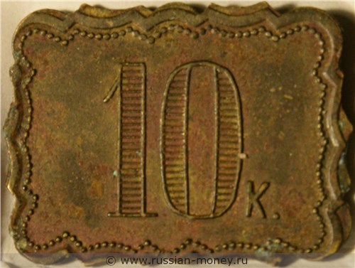 На фото показаны обе стороны одного жетона. На лицевой стороне внутри точечного ободка, повторяющего форму жетона, указание номинала - "10 к." (цифры имеют горизонтальную штриховку), по периметру выступающий кант. На обороте указание номинала - "10 коп." (цифры имеют сетчатую штриховку, буквы расположены под цифрами), поле гладкое.