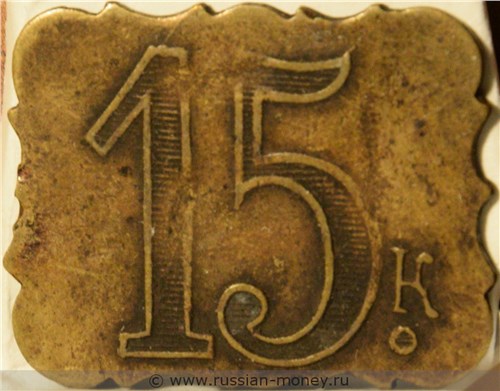 На фото показаны обе стороны одного жетона. На лицевой стороне внутри узорчатого ободка, повторяющего форму жетона, указание номинала - "15 к." (точка расположена под буквой). На обороте указание номинала - "15 коп." (цифры имеют горизонтальную штриховку, точка расположена под буквой), поле гладкое.