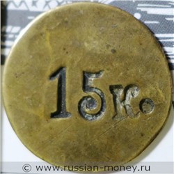 На фото показаны обе стороны одного жетона. На лицевой стороне выбит номинал - "15 к.", на обороте гладкое поле без надписей.
