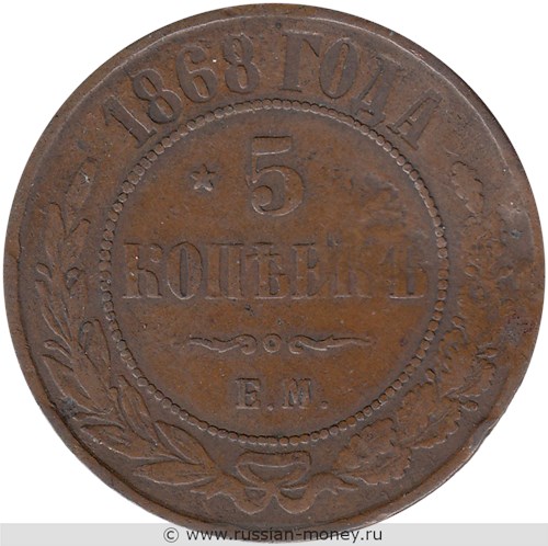 На реверсе монеты центральная часть отделена бусовым ободком, внутри которой помещён номинал в две строки: "5 КОПЕЕКЪ". По бокам цифры "5" имеется две звёздочки. Под номиналом - растительный орнамент с кругом в центре, ещё ниже - буквы "Е.М." (екатеринбургская монета). На внешней части монеты вверху полукругом указан год чеканки - "1868" и слово "ГОДА", остальное пространство заполнено двумя ветвями - дуба и лавра, перевязанными лентой.