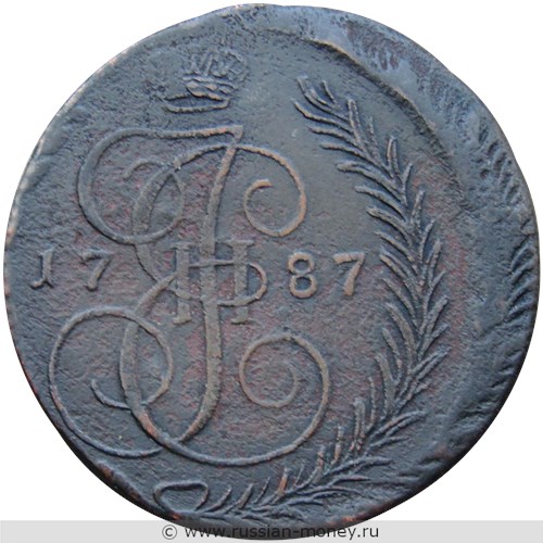 На аверсе монеты изображён вензель Екатерины II, составленный из букв "I" (императрица), "Е" (Екатерина) и римской цифры "II". Наверху императорская корона. По бокам указан год, разделённый на две части - "17" и "87". Окружают изображения две ветви, связанные внизу бантом.