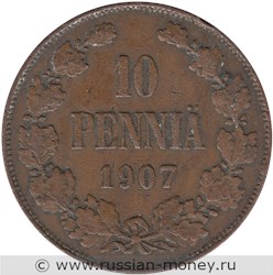 На реверсе монеты в центре указан номинал на финском языке: вверху число "10", ниже - "PENNIÄ". Ещё ниже год чеканки - "1907". Надписи окружены двумя дубовыми ветвями, связанными внизу лентой.