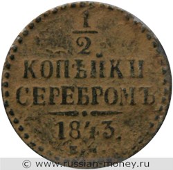На реверсе монеты вверху дробью указан номинал: цифра "1", под ней горизонтальная черта, и ниже - цифра "2" (т.е. 1/2). Под номиналом в две строки надпись - "КОПЕЙКИ СЕРЕБРОМ" (привязка к серебряному рублю), ещё ниже горизонтальная черта, состоящая из двух сужающихся к краям линий с точкой посередине, под ней указана дата чеканки - "1843.". В самом низу - буквы "Е.М." (екатеринбургская монета).