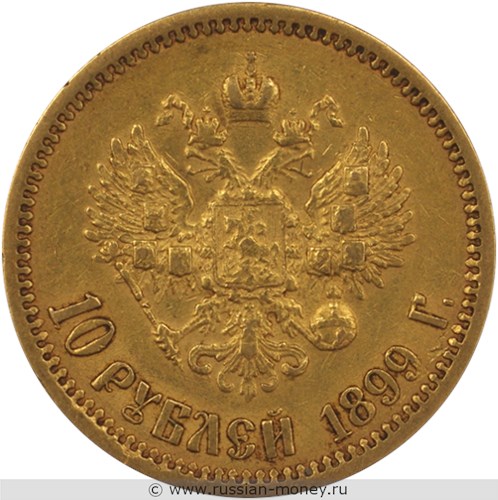 Монеты номиналом 10 рублей 1899 года Санкт-Петербургского монетного двора выпускались в соответствии с приведёнными ниже характеристиками. Цена среди коллекционеров отличается в зависимости от сохранности, средняя стоимость около 93000 р.