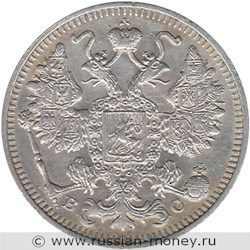 На реверсе монеты в центре указан номинал: число "15", под ним слово "КОПЕЕК". Слева и справа от числового обозначения номинала имеется две звёздочки, над числом - имперская корона. Под номиналом орнамент в виде двух стилизованных линий, между которыми розетка. Ниже - год чеканки "1913", ещё ниже - буквы "С.П.Б.", означающие "Санкт-Петербург". По краям монеты имеется венок из двух ветвей, связанных внизу лентой.