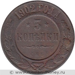 На реверсе монеты центральная часть отделена бусовым ободком, внутри которой помещён номинал в две строки: "3 КОПЕЙКИ". По бокам цифры "3" имеется две звёздочки. Под номиналом - растительный орнамент с кругом в центре, ещё ниже - буквы "С.П.Б.", что означает "Санкт-Петербург". На внешней части монеты вверху полукругом указан год чеканки - "1902" и слово "ГОДА", остальное пространство заполнено двумя ветвями - дуба и лавра, перевязанными лентой.