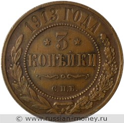 На реверсе монеты центральная часть отделена бусовым ободком, внутри которой помещён номинал в две строки: "3 КОПЕЙКИ". По бокам цифры "3" имеется две звёздочки. Под номиналом - растительный орнамент с кругом в центре, ещё ниже - буквы "С.П.Б.", что означает "Санкт-Петербург". На внешней части монеты вверху полукругом указан год чеканки - "1913" и слово "ГОДА", остальное пространство заполнено двумя ветвями - дуба и лавра, перевязанными лентой.