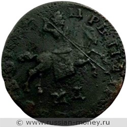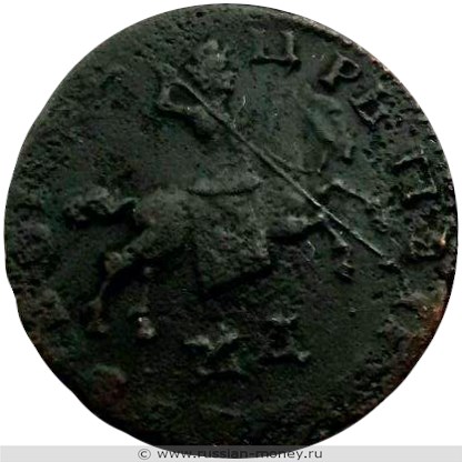 Данный тип копеек с надписью "ПОВЕЛИТЕЛЬ" и всадником без плаща выпускался в 1704-1705 и 1707-1718 годах. На некоторых экземплярах частично может присутствовать кант по окружности лицевой и оборотной сторон, состоящий из квадратных точек.