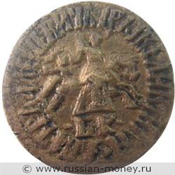 На аверсе монеты в центральной части помещено изображение Георгия Победоносца с копьём в правой руке, сидящим на коне. Под всадником буквы "•Б•К•" (большая казна). Вокруг имеется надпись: "• ЦРЬ IВЕЛИКIИ КНЗЬ ПЕТРЪ АЛЕЗIЕВИЧЬ" (царь и великий князь Пётр Алексеевич).