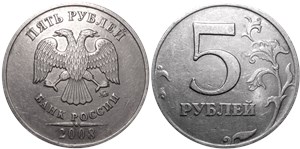 Цена монеты 5 рублей 2008 года со знаком ММД на нумизматических аукционах и ярмарках