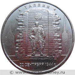 На реверсе монеты на фоне кирпичной стены с Орденом Отечественной войны изображён памятник воину-освободителю, расположенный в Таллине, на заднем плане очертания современного города. Вверху полукругом между двумя пятиконечными звёздами надпись - "ТАЛЛИН", внизу под изображениями горизонтально указана дата освобождения Таллина - "22 СЕНТЯБРЯ 1944 г.".