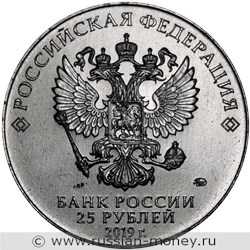 На аверсе рельефное изображение герба Российской Федерации (двуглавый орёл со скипетром и державой, на груди - Георгий Победоносец, поражающий копьём змея). Справа внизу знак монетного двора (ММД - Московский). Под орлом указан номинал - "25 РУБЛЕЙ", ниже дата выпуска - "2019 г.". Вверху вдоль канта полукругом обозначено название страны - "РОССИЙСКАЯ ФЕДЕРАЦИЯ". В начале и конце надписи имеется орнамент из двух объединённых квадратов.