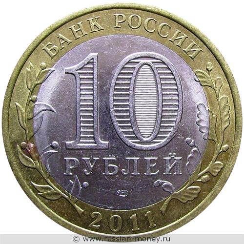 На аверсе монеты посередине в две строки указан номинал (число "10", под ним слово "РУБЛЕЙ"), ещё ниже имеется знак Санкт-Петербургского монетного двора (состоит из букв "СПМД"). Внутри цифры "0" попеременно при изменении угла наклона просматривается число "10" и слово "РУБ". По окружности вверху надпись "БАНК РОССИИ", внизу год чеканки - "2011", слева лавровая ветвь, справа дубовая.