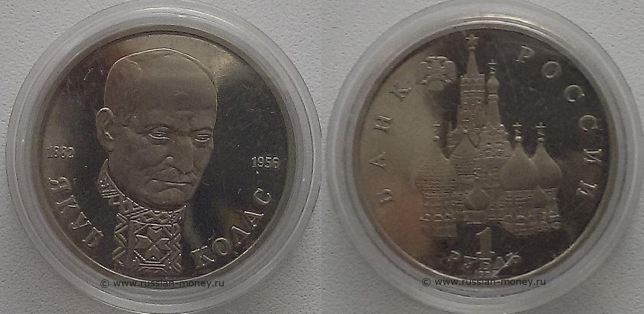 На реверсе монеты рельефно изображён портрет Якуба Коласа в анфас, лицом вправо (на рубашке виден национальный белорусский узор). Внизу вдоль канта полукругом надпись: "ЯКУБ КОЛАС" (слова разделены рубашкой). Слева указан год рождения - "1882", справа год смерти - "1956".