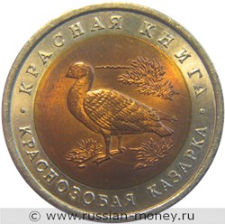 На реверсе монеты в центре (на жёлтом диске) изображение краснозобой казарки среди растительности. По окружности вверху надпись - "КРАСНАЯ КНИГА", внизу - "КРАСНОЗОБАЯ КАЗАРКА". Надписи разделены точками.