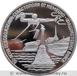 На реверсе монеты рельефно изображены основные достопримечательности Севастополя, связанные с Великой Отечественной войной: на переднем плане памятник затопленным кораблям, на заднем - Графская пристань и здание Матросского клуба. Над бухтой расположен фрагмент Мемориала мужеству защитников Севастополя. Над символичным изображением морских волн парит чайка. По окружности имеется надпись: "50-летие ОСВОБОЖДЕНИЯ г. СЕВАСТОПОЛЯ ОТ НЕМЕЦКО-ФАШИСТСКИХ ВОЙСК".