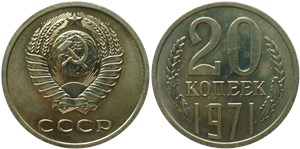Монеты номиналом 20 копеек 1971 года выпускались в соответствии с приведёнными ниже характеристиками. Цена среди коллекционеров отличается в зависимости от сохранности, средняя стоимость около 6200 р.