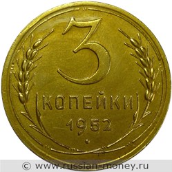 Монеты номиналом 3 копейки 1952 года имеют 10 разновидностей, описанных ниже. Цена среди коллекционеров отличается в зависимости от сохранности, средняя стоимость около 80 р.