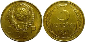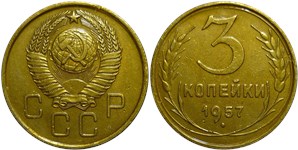 Цена монеты 3 копейки 1957 года на нумизматических аукционах и ярмарках