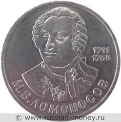 На реверсе монеты рельефное изображение портрета М.В. Ломоносова (выполнен в полуанфас, повёрнут влево), под ним вдоль канта расположена надпись полукругом "М.В. ЛОМОНОСОВ", справа в две строки указаны годы жизни учёного - "1711" и "1765".