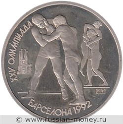 На реверсе монеты на переднем плане изображены современные борцы, слева помещено маленькое изображение собора Саграда Фамилия в Барселоне - знаменитого творения архитектора Гауди. На заднем плане в правой части монетного поля - древнегреческие борцы, выполненные по рисунку на античной вазе, под ними расположен греческий национальный орнамент. Внизу полукругом вдоль канта надпись: "БАРСЕЛОНА 1992", слева также полукругом: "XXV ОЛИМПИАДА".