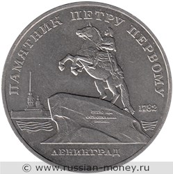 На реверсе монеты рельефно изображён памятник Петру I (Медный всадник) в Ленинграде, справа от него дата установки - "1782", на заднем плане панорама реки Невы с Петропавловской крепостью. Под монументом горизонтальная надпись «ЛЕНИНГРАД». В верхней части поля монеты полукругом вдоль канта расположена надпись: «ПАМЯТНИК ПЕТРУ ПЕРВОМУ»